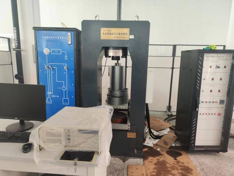 该设备主机采用整体铸造的门式加载框架,油缸下置,承载框架刚度可达8GN/m。围压室采用优质合金钢锻件,表面镀硬铬。测试系统采用先进的数字测控技术与电液伺服系统相结合,精确地实现了试验过程的三种控制方式(力、变形、位移),并且可以相互间无冲击平滑转换。控制系统采用德国DOLI公司EDC全数字伺服测控器,这种测控器具有多个测量通道,可以对其中任意一通道进行闭环控制,该测控器的操作方便,容错性强、测量准确、保护功能全、控制精度高。电液伺服阀采用电液伺服阀,具有响应快、抗污染能力强等特点。试验机的计算机系统采用凌华工业控制计算机具有良好的人机界面,可以显示试验力、位移、变形(轴向、径向)、围压、控制方式、加载速率等试验参数。试验完成后可以进行曲线分析,打印试验报告等。