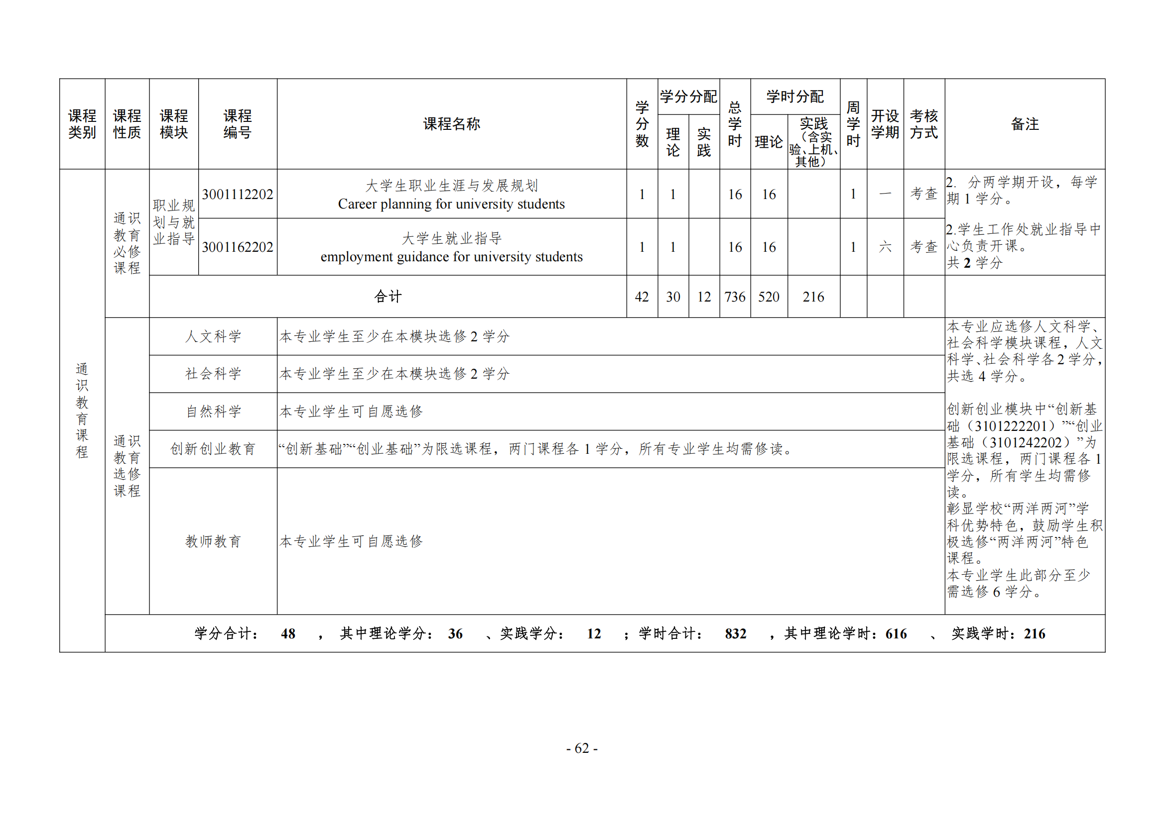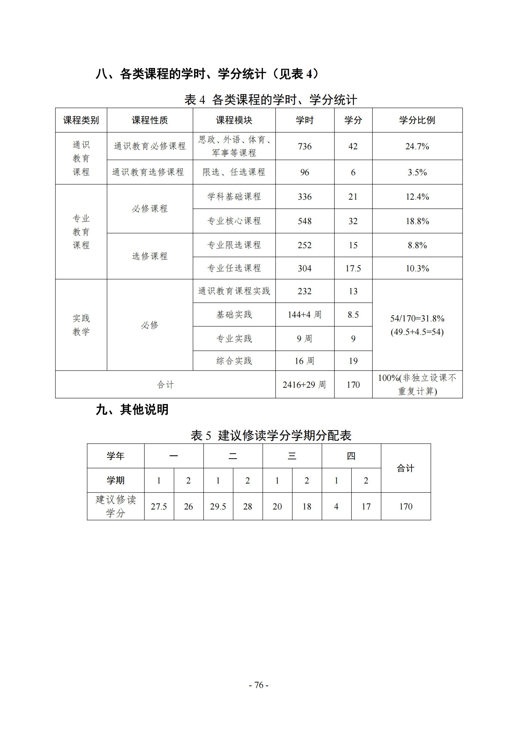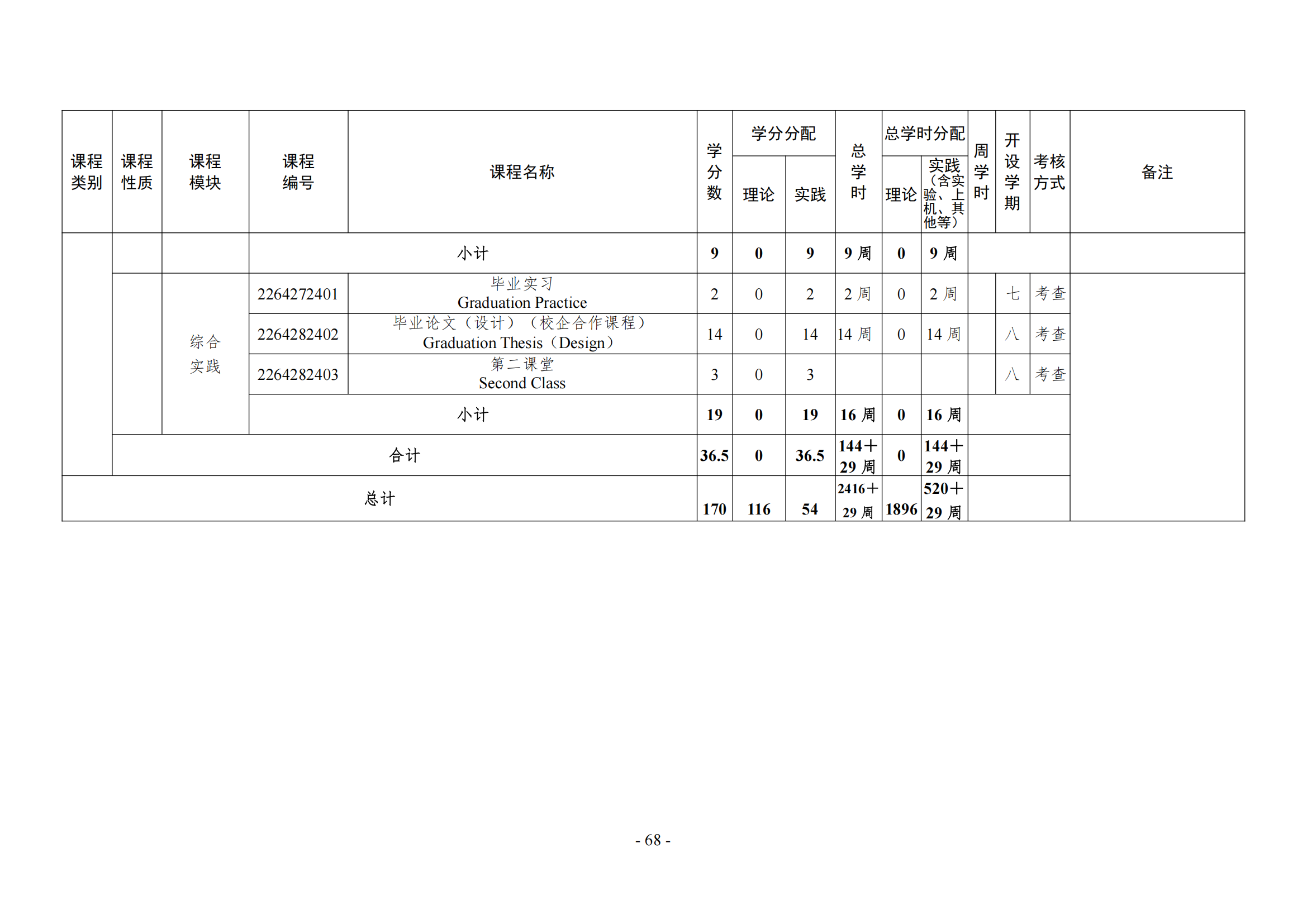 本专业标准学制为四年,学校实行学分制下的弹性学制。计划总学时为 2416 学时,总学分为170 学分。允许学生在 3~8 年内修完规定课程,修满规定学分,准予毕业。符合学位授予条件者,经校学位委员会审核通过,可授予工学学士学位。