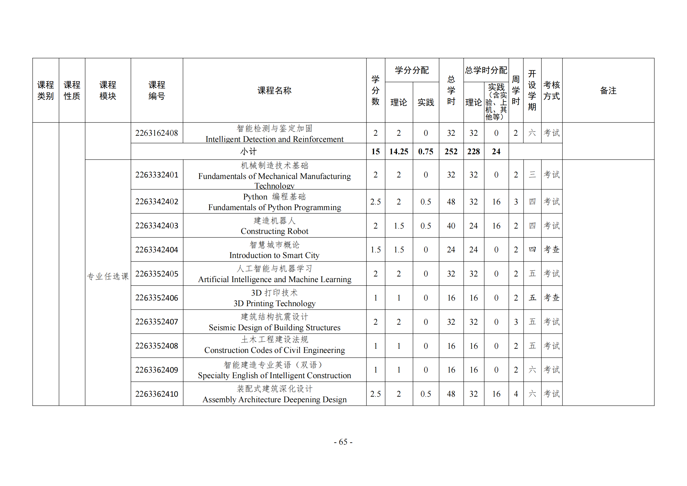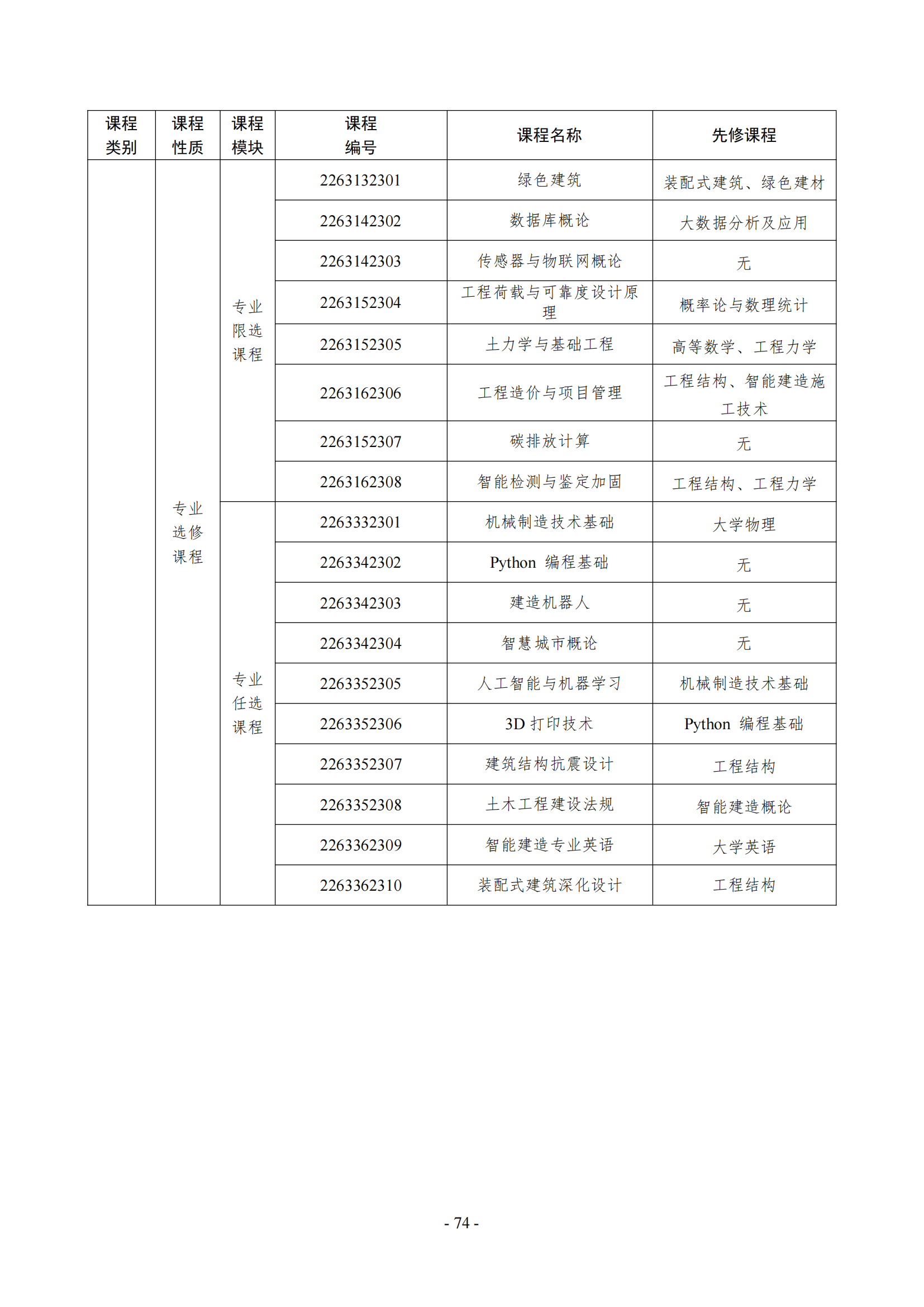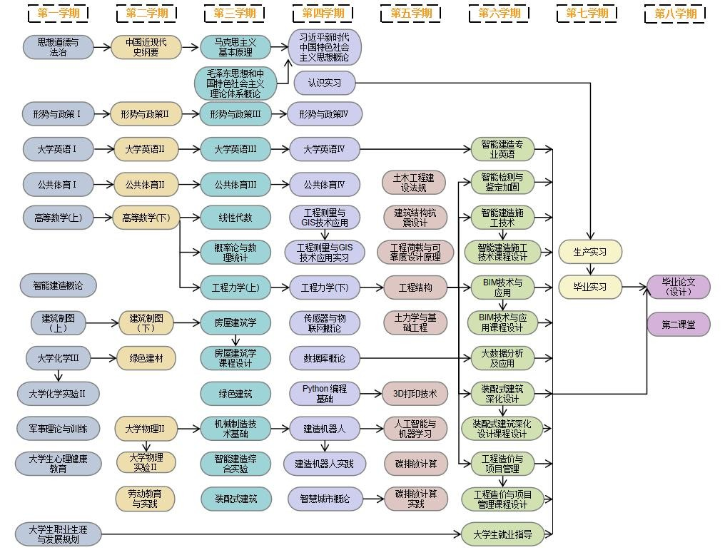 大学英语、高等数学、线性代数、概率论与数理统计、大学物理、大学化学、智能建造概论、建筑制图、绿色建材、房屋建筑学、工程力学、工程测量与 GIS 技术应用、工程结构、装配式建筑、BIM 技术与应用、大数据分析及应用、智能建造施工技术、绿色建筑、数据库概论、传感器与物联网概论、工程荷载与可靠度设计原理、土力学与基础工程、工程造价与项目管理、碳排放计算、智能检测与鉴定加固、机械制造技术基础、Python 编程基础、建造机器人、智慧城市概论、人工智能与机器学习、3D 打印技术、建筑结构抗震设计、装配式建筑深化设计等。
