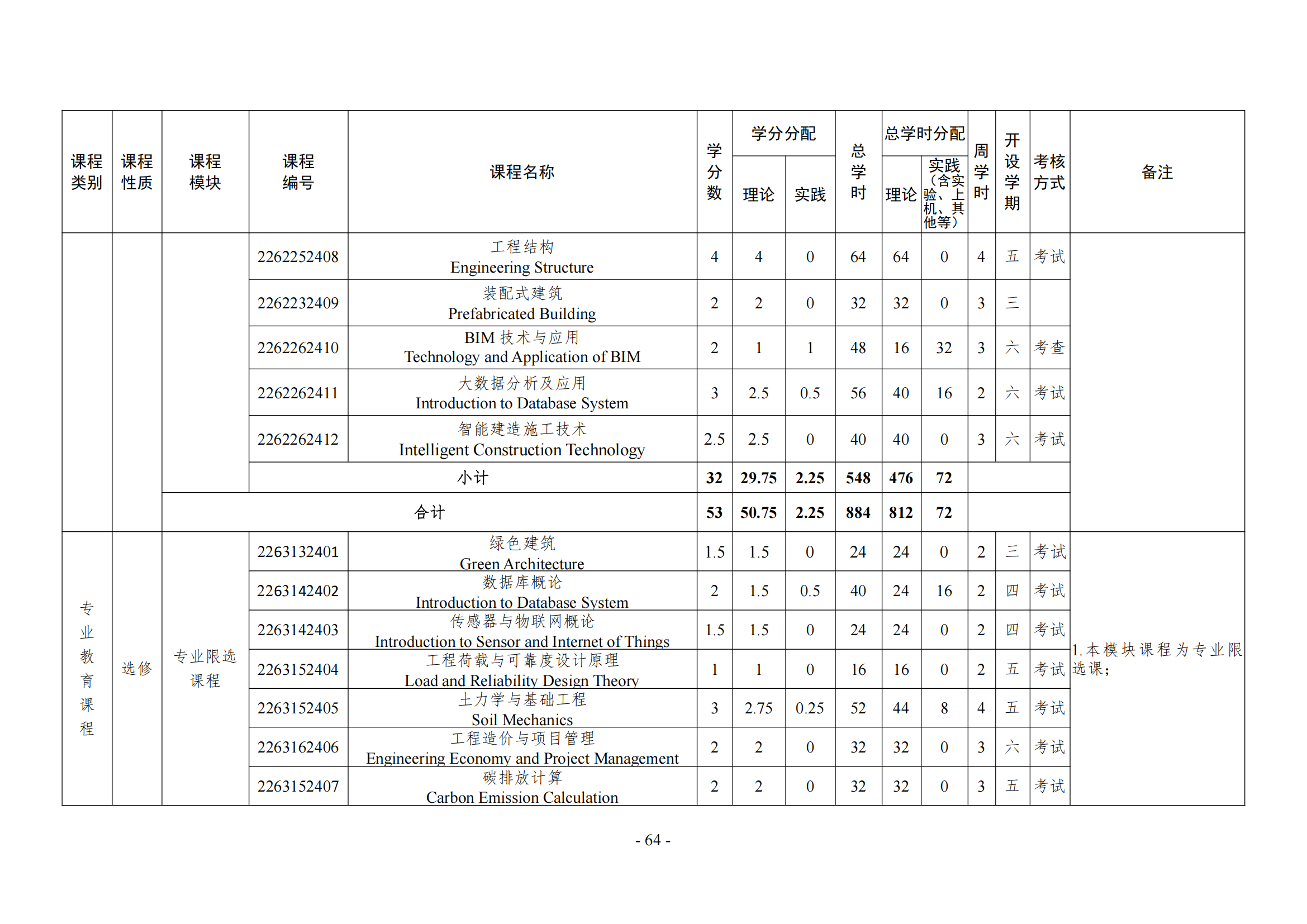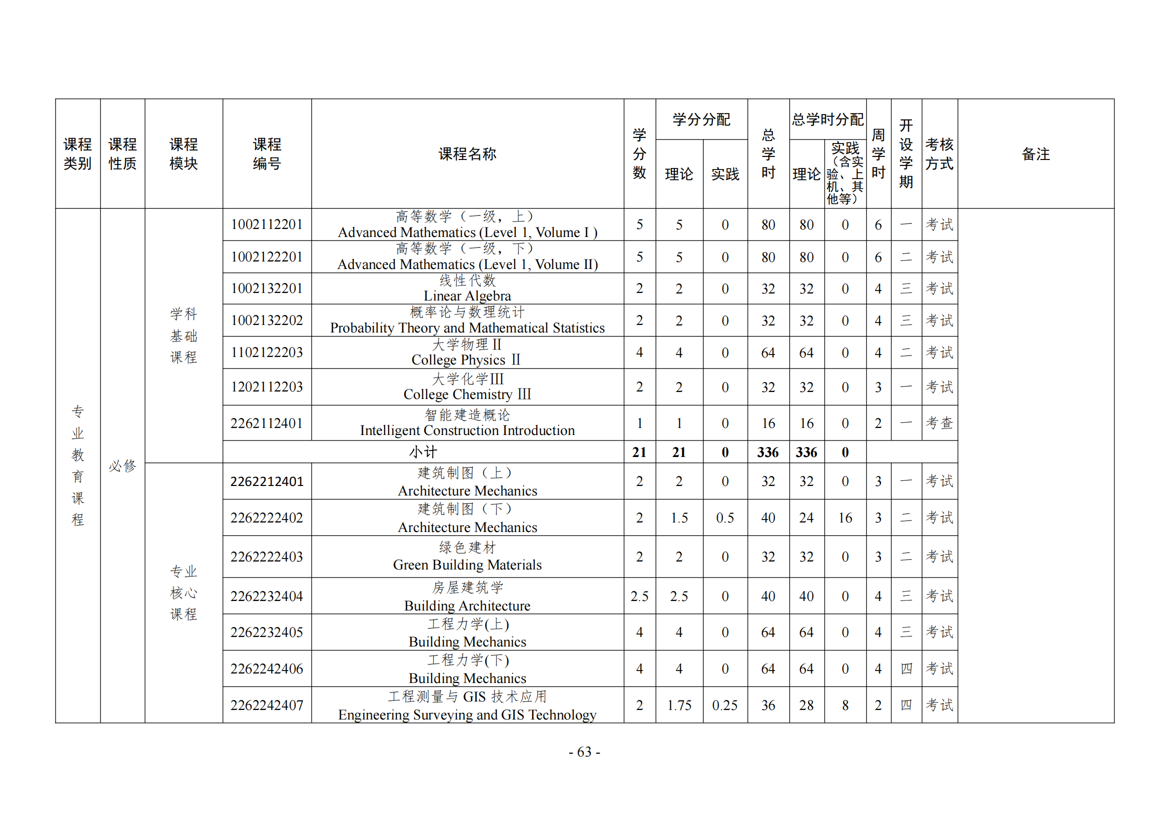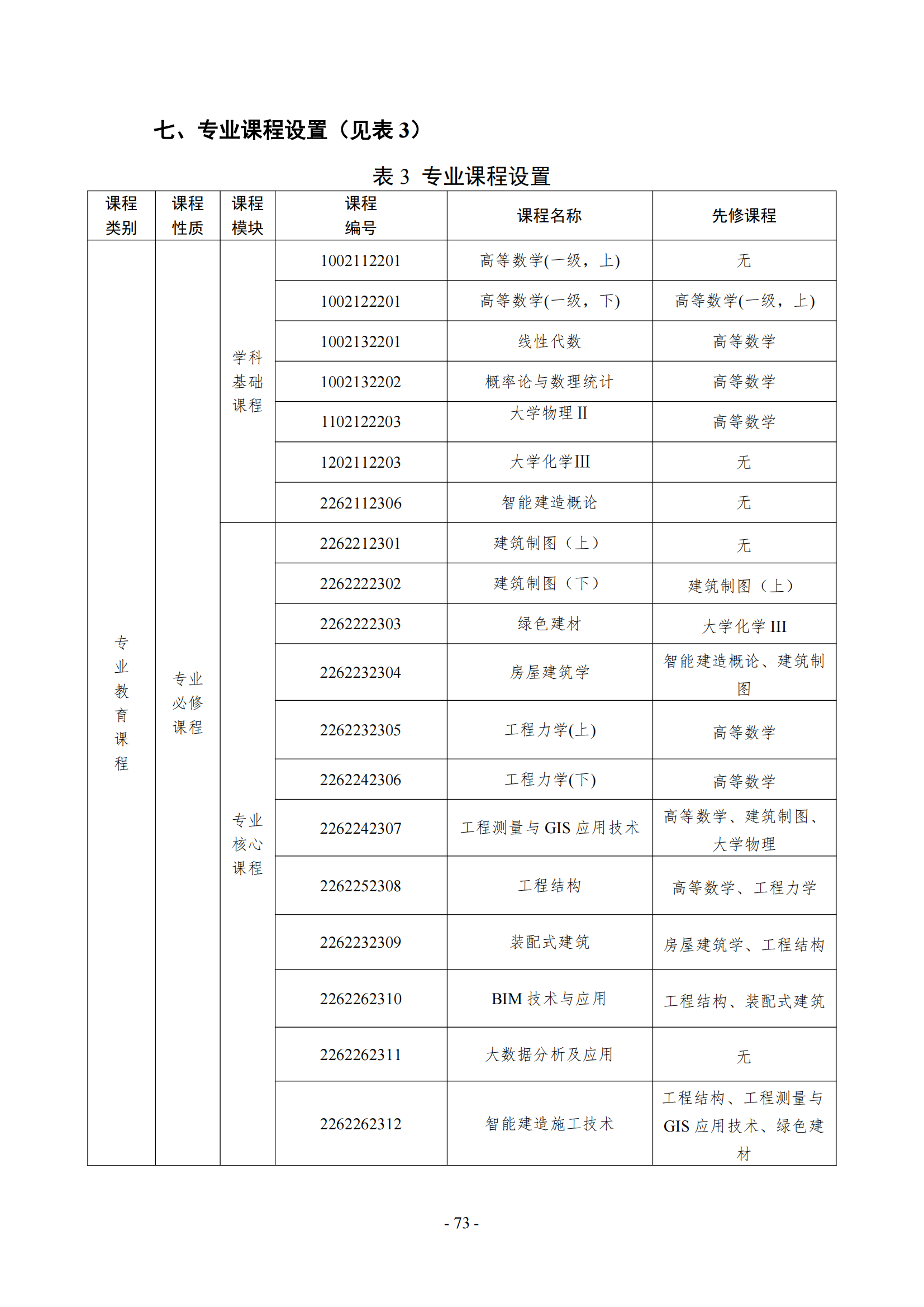 大学英语、高等数学、线性代数、概率论与数理统计、大学物理、大学化学、智能建造概论、建筑制图、绿色建材、房屋建筑学、工程力学、工程测量与 GIS 技术应用、工程结构、装配式建筑、BIM 技术与应用、大数据分析及应用、智能建造施工技术、绿色建筑、数据库概论、传感器与物联网概论、工程荷载与可靠度设计原理、土力学与基础工程、工程造价与项目管理、碳排放计算、智能检测与鉴定加固、机械制造技术基础、Python 编程基础、建造机器人、智慧城市概论、人工智能与机器学习、3D 打印技术、建筑结构抗震设计、装配式建筑深化设计等。