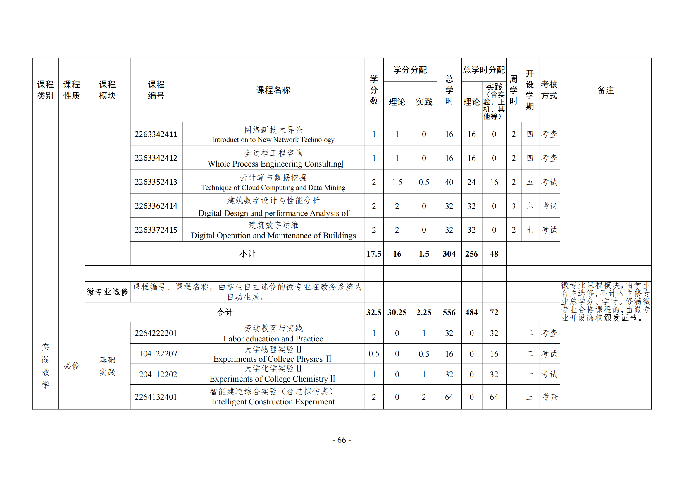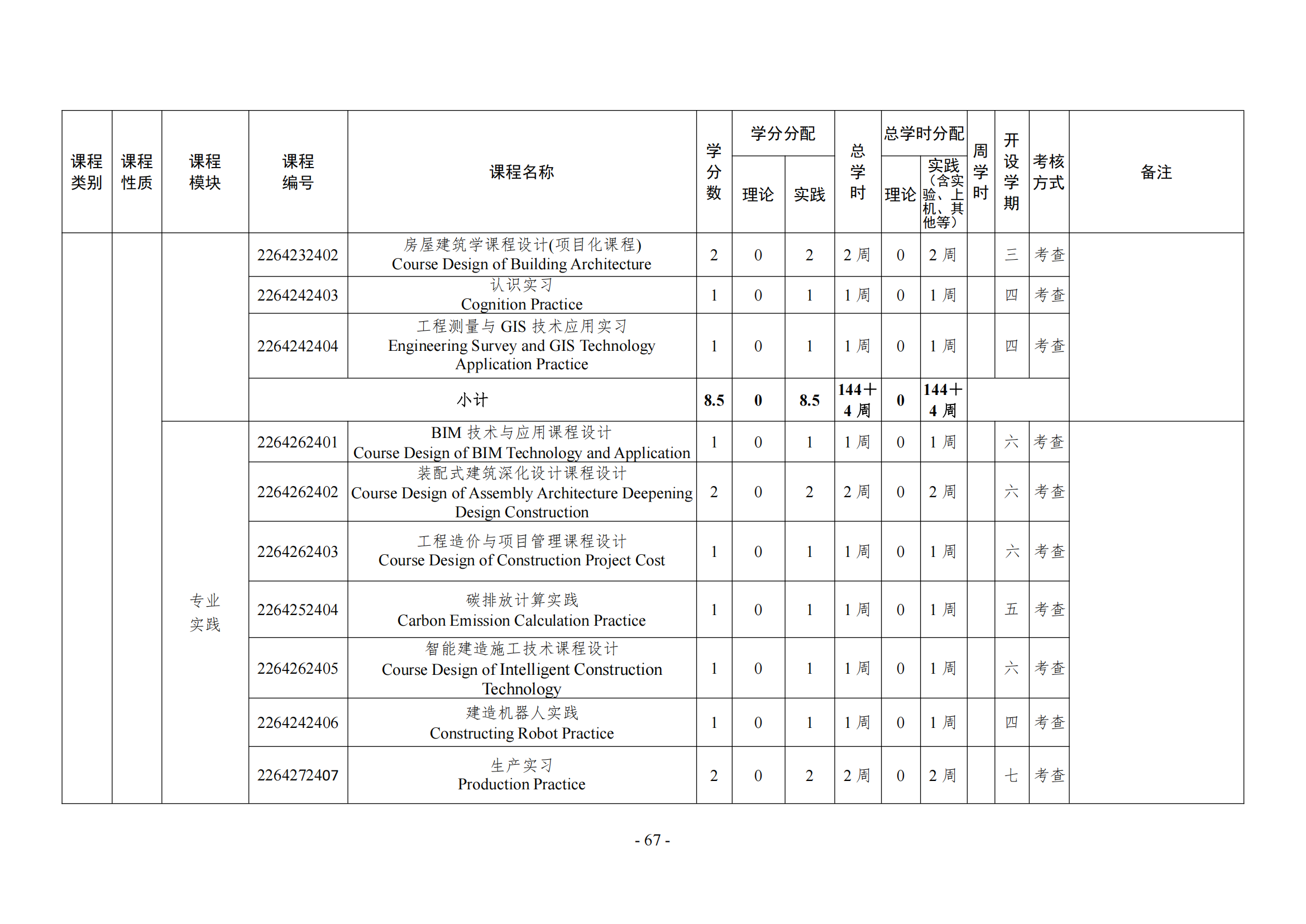 大学物理实验、大学化学实验、智能建造综合实验(含虚拟仿真)、房屋建筑学课程设计、工程测量与 GIS 技术应用实习、BIM 技术与应用课程设计、装配式建筑深化设计课程设计、工程造价与项目管理课程设计、碳排放计算实践、智能建造施工技术课程设计、建造机器人实践、认识实习、生产实习、毕业实习、毕业设计等。