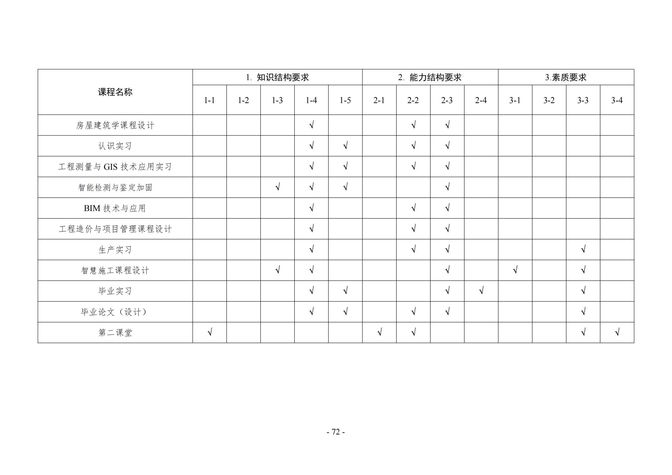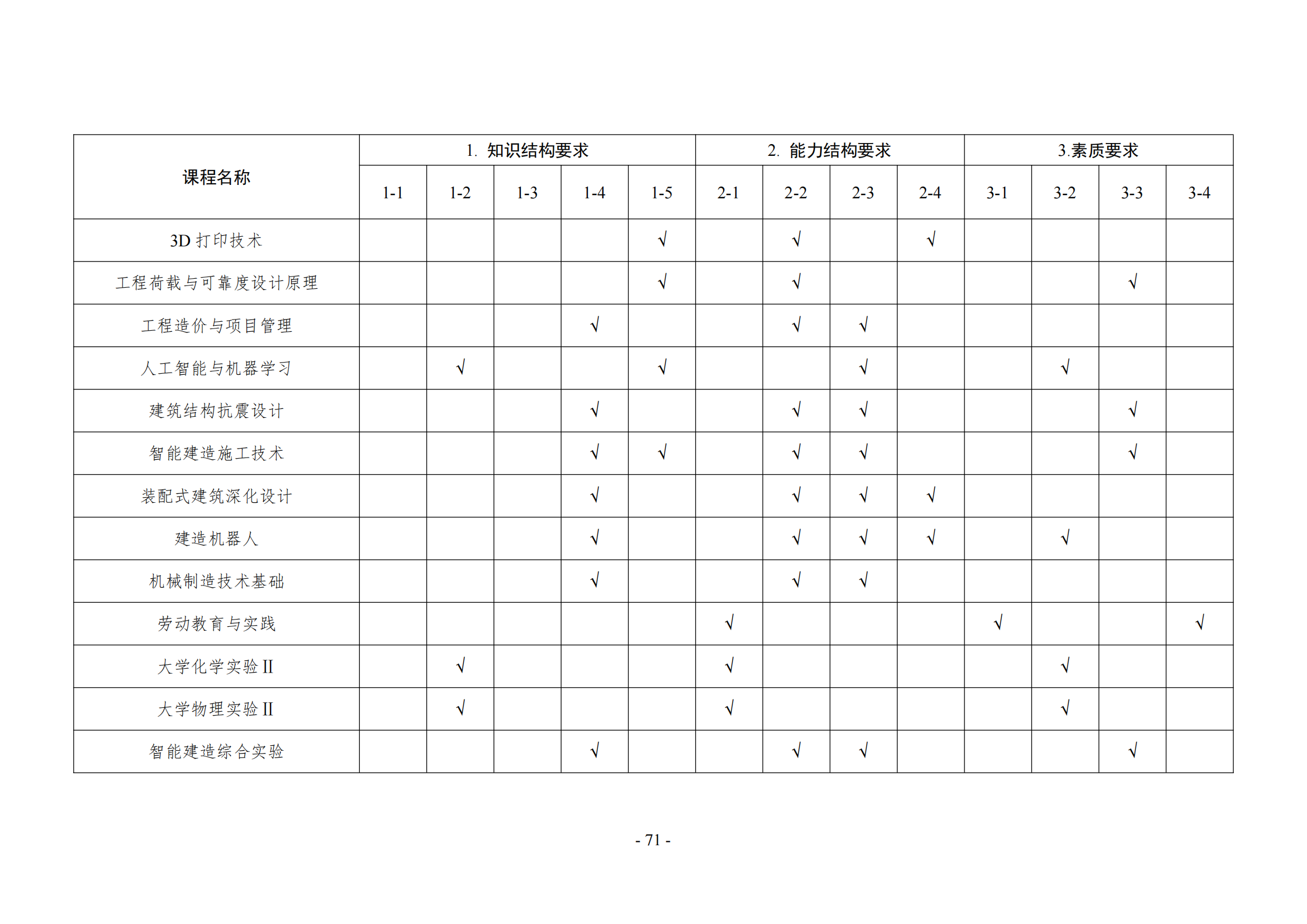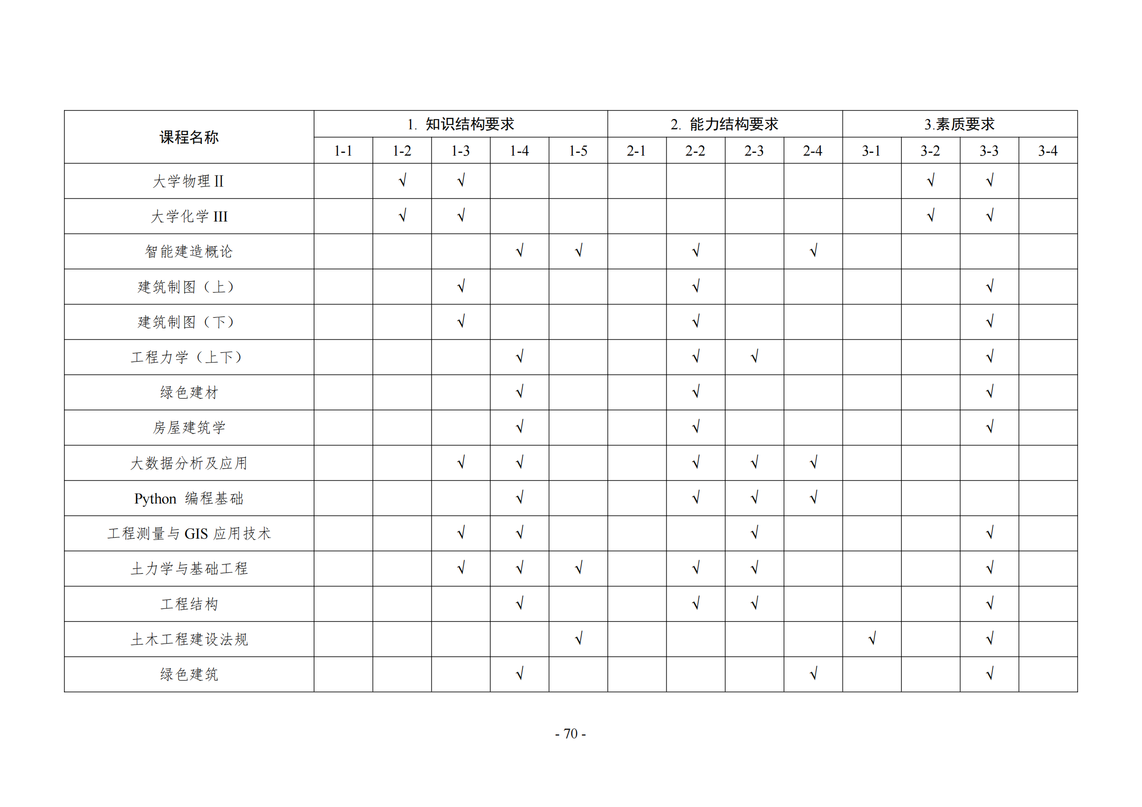 2-2:专业能力:具有工程结构选型、结构设计、材料选择的能力;具有智能化工程建造、项目管理和技术经济分析的能力;具有计算机的编程能力和逻辑思维能力;具有使用和分析专业大数据的初步能力;具有采用信息技术和云平台解决专业问题的能力;具有一定的组织协调能力。