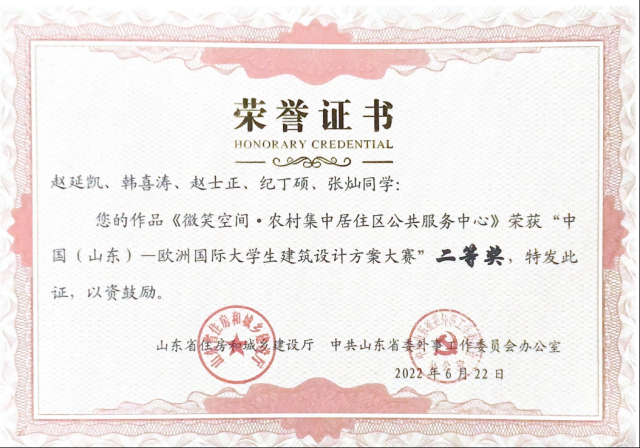 学生在“中国(山东)—欧洲国际大学生建筑设计方案大赛”中获奖