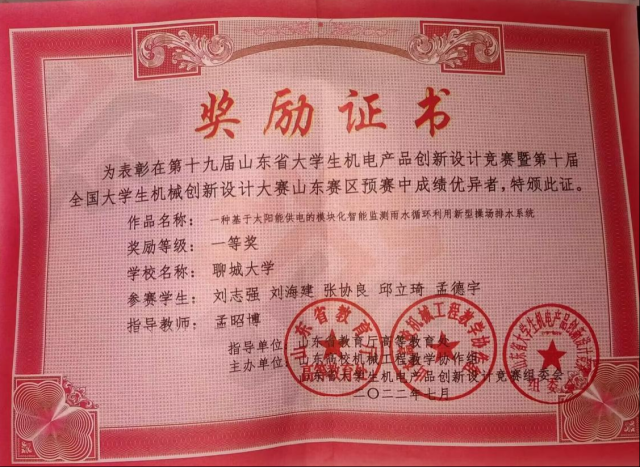 恭喜色情网站 2020级优秀学生孟德宇,在“第十九届山东省大学生机电产品创新设计竞赛暨第十届全国大学生机械创新设计大赛山东赛区预赛中”,荣获一等奖。