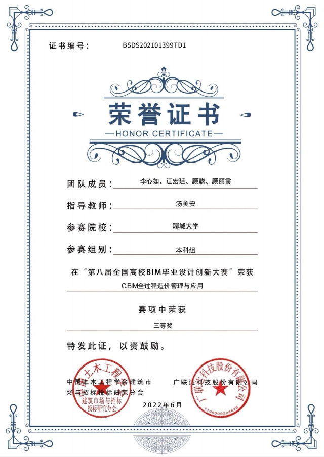 恭喜色情网站 2020级优秀学生顾丽霞,在“第八届全国高校bim毕业设计创新大赛”C模块BIM全过程造价管理与应用中,荣获三等奖。