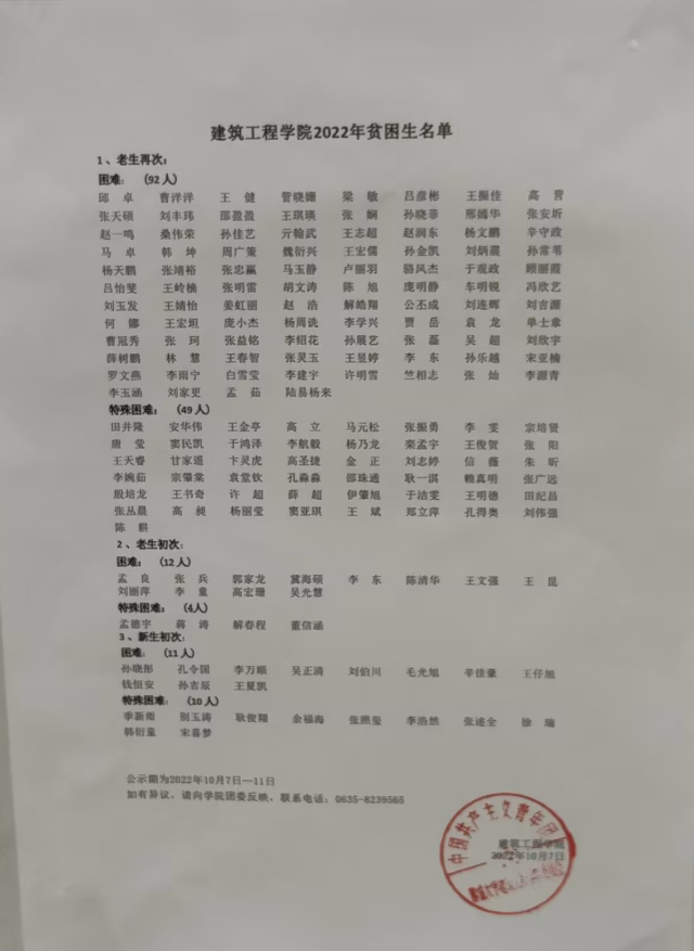 2022年家庭经济困难认定经本人申请、班级评议和公示、学院家庭经济困难学生认定小组综合评定,现将2022年家庭经济困难学生拟推荐结果予以公示,公示3个工作日,自2022年10月7日—2022年10月11日,如有异议请于公示期内反映,电话0635-8239565,接受来访地点:建筑部工程学院五号教学楼A区201。