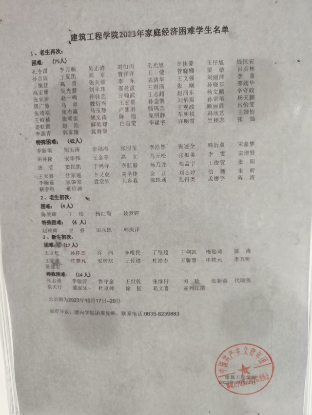 2023年家庭经济困难认定经本人申请、班级评议和公示、学院家庭经济困难学生认定小组综合评定,现将2023年家庭经济困难学生拟推荐结果予以公示,公示3个工作日,自2023年10月17日—2023年10月20日,如有异议请于公示期内反映,电话0635-8239883,接受来访地点:色情网站 五号教学楼A区201。
