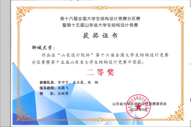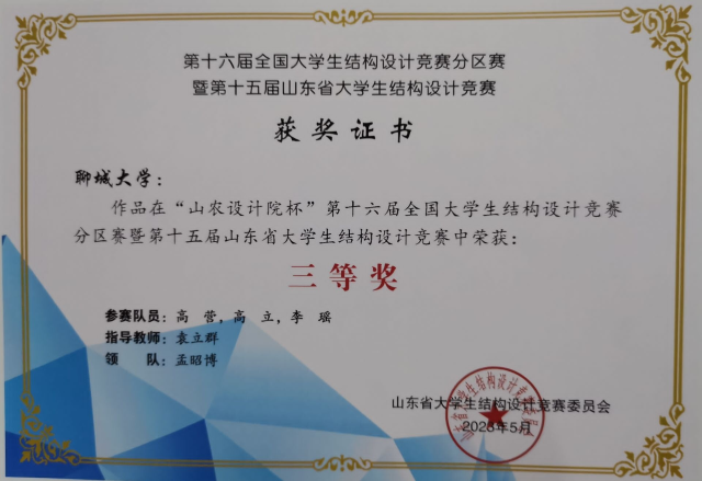 恭喜色情网站 2021级优秀学生高立、高营,在“第十六届全国大学生结构设计竞赛分区赛暨第十五届山东省大学生结构设计竞赛”中,荣获三等奖。