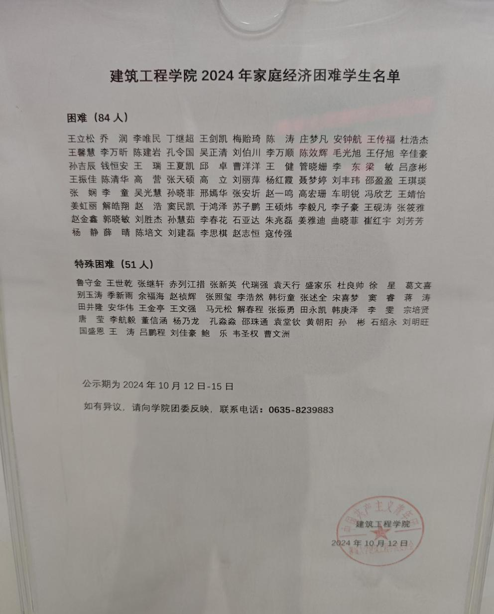 2024年家庭经济困难认定经本人申请、班级评议和公示、学院家庭经济困难学生认定小组综合评定,现将2024年家庭经济困难学生拟推荐结果予以公示,公示3个工作日,自2024年10月12日—2024年10月15日,如有异议请于公示期内反映,电话0635-8239883,接受来访地点:色情网站 五号教学楼A区201。