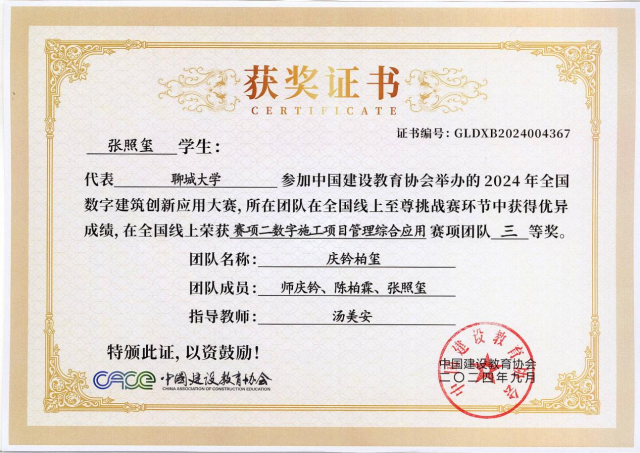 恭喜色情网站 2022级优秀学生张照玺,在“全国数字建筑创新应用大赛”中,荣获三等奖。