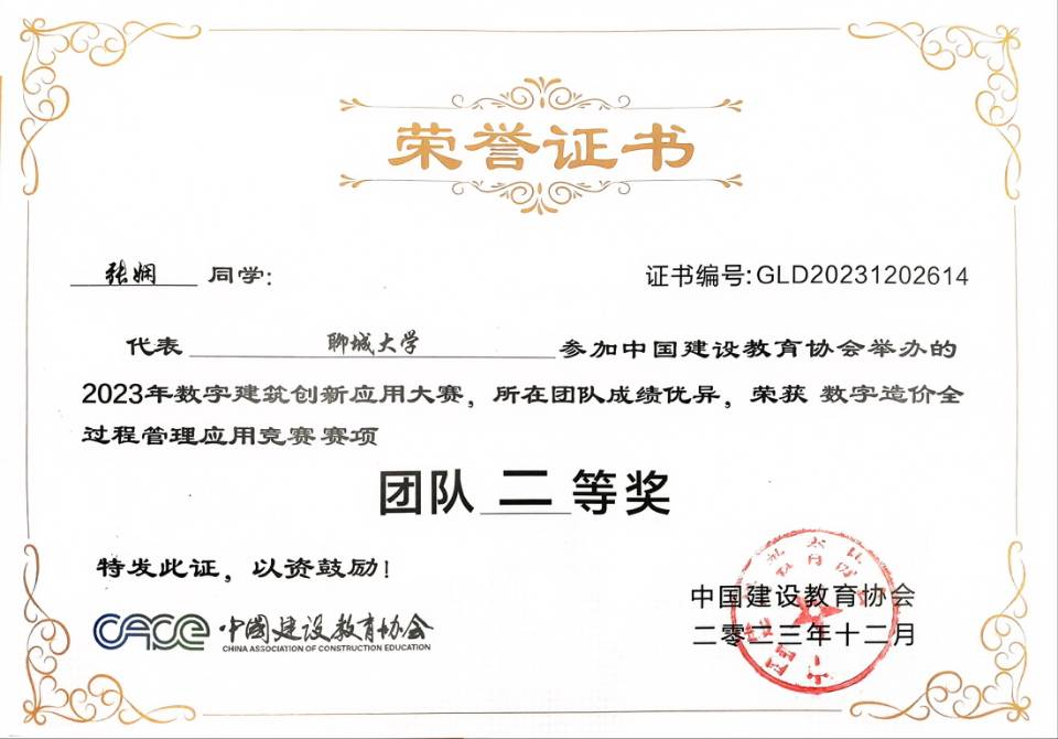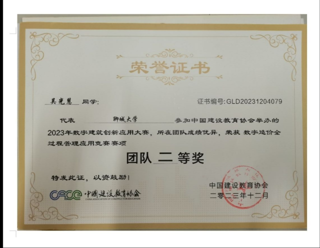 恭喜色情网站 2021级优秀学生张娴、吴光慧在“数字建筑创新应用大赛”中,荣获 数字造价全过程管理应用竞赛赛项团队二等奖。
