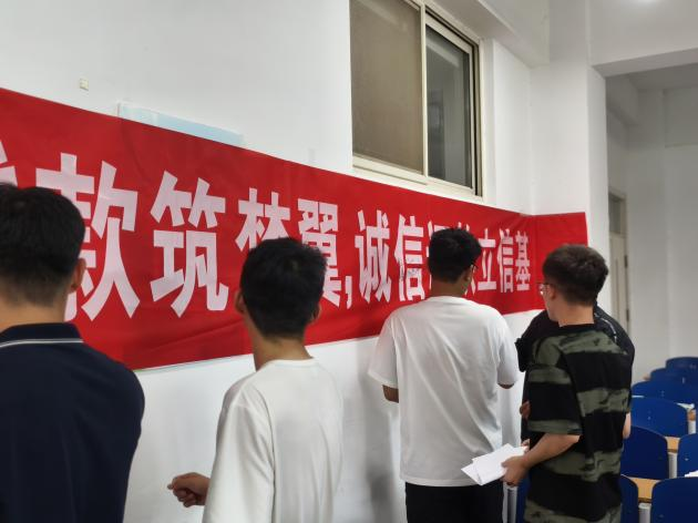 在签名仪式现场悬挂着“助学贷款筑梦翼,诚信还款立信基”的红色横幅。活动负责人对贷款诚信事宜进行了深入细致的讲解,随后同学们依次来到签字台前,虔诚地执笔,在条幅上签下自己的名字。签字台旁摆放着“珍爱信用记录 享受幸福人生”的提示牌,时时刻刻提醒着同学们诚信的重要性。签名期间工作人员时刻提醒毕业生注意事项。最终,全体毕业生手持承诺书合影留念,镜头定格下他们坚毅而自信的面庞,为大学生活画上圆满句号的同时,也开启了诚信人生的新篇章。