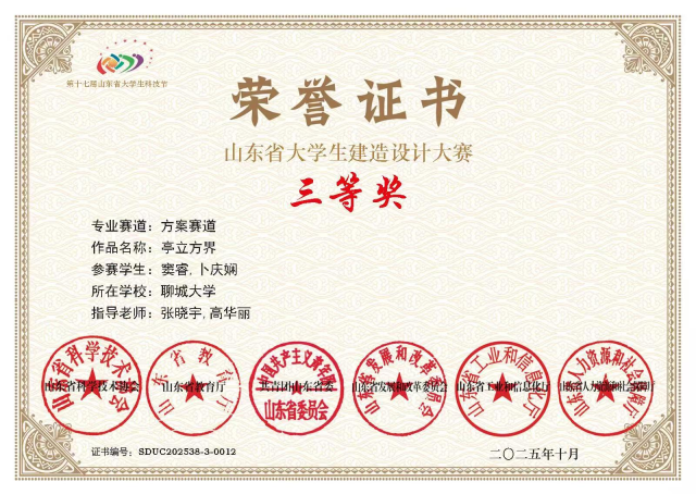 恭喜色情网站 2022级优秀学生窦睿在第六届“山东省大学生建造设计大赛”荣获团队三等奖。