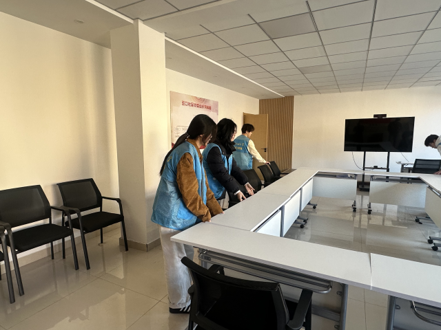 同学们根据会议室功能布局制定分工方案,划分为清洁消杀组、物资整理组、设施维护组三个小组同步推进。清洁消杀组携带扫帚、抹布、消毒湿巾等工具,从地面清洁入手,细致清理墙角积灰、踢脚线污渍等卫生盲区;物资整理组则对文件柜内的档案资料进行分类归档,按照“常用文件外置、历史资料入盒”的原则规范摆放,同时补充便签、中性笔等会议必需品;设施维护组的同学展现出建筑专业特色,使用水平仪校准墙面展板,修复窗帘轨道并更换照明设备。在环境美化环节,同学们创意性地将绿萝盆栽均匀摆放在窗台与文件柜顶部,为严肃的会议空间增添生机。
