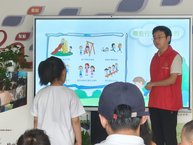 同学们围绕“居家用电、防溺水、交通安全”等儿童暑期高频风险,设计了动画演示、互动问答等环节。从“红灯停绿灯行”的交通规则,到“远离陌生水域”的防溺水警示,再到“不给陌生人开门”的居家提示,同学们细致的为小朋友讲解相关安全知识。在其中穿插的情景问答环节中,小朋友踊跃举手回答,同学们对其实时纠正、补充知识,让小朋友在互动中逐步建立安全认知,真正能让安全技从“听懂”变成“会用”。随后同学们还和小朋友进行趣味魔术,希望安全知识能和魔术一样“住进”孩子心里。同学们表示,后续将定期更新汛期避险、消防常识等安全主题,在欢笑声中强化儿童主动防护的意识,让安全意识扎根更多家庭。