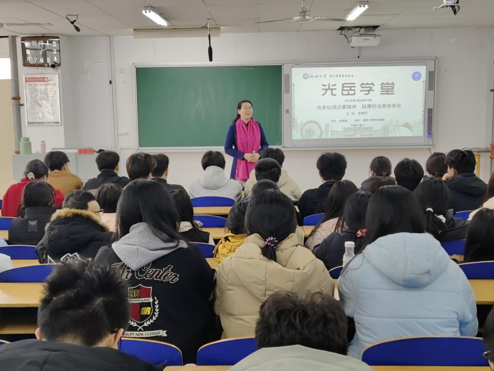 李德芳以“传承弘扬沂蒙精神,挺膺担当青春使命”为主题,从沂蒙精神的核心内涵和时代价值两个方面展开讲座。她深情引用沂蒙山区广为传唱的民谣“最后的一碗米用来做军粮,最后的一尺布用来做军装”,将明德英用乳汁救伤员的沂蒙哑娘与王换于创办战时托儿所的故事娓娓道来。她讲到,沂蒙精神起源于烽火与硝烟,其核心内涵是“党群同心、军民情深、水乳交融、生死与共”,鼓励同学们学习其深刻的时代价值。她表示沂蒙精神在新时代的中国正彰显出历久弥新的时代价值,勉励同学们从四个维度践行使命:一是坚定理想信念,树立远大理想;二是主动迎难而上,扛起时代重任;三是弘扬团结协作,凝聚奋进合力;四是传承创新精神,贡献青春力量。