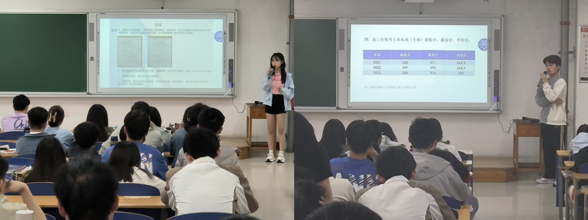 贾岳细化每科的备考方案,向同学们讲解每科备考时的参考资料、网课老师以及每科最后要刷的模拟题。屈萧迪从近几年考研分数的分析入手,向同学们介绍了中国地质大学的招生和录取情况,通过公共课和专业课两个方面分享自己的复习计划和学习方法,进行针对性答疑;李绪栋对比分析近几年考研相关数据,介绍了选择北京工业大学的原因并分享了公共课和专业课的复习书籍。