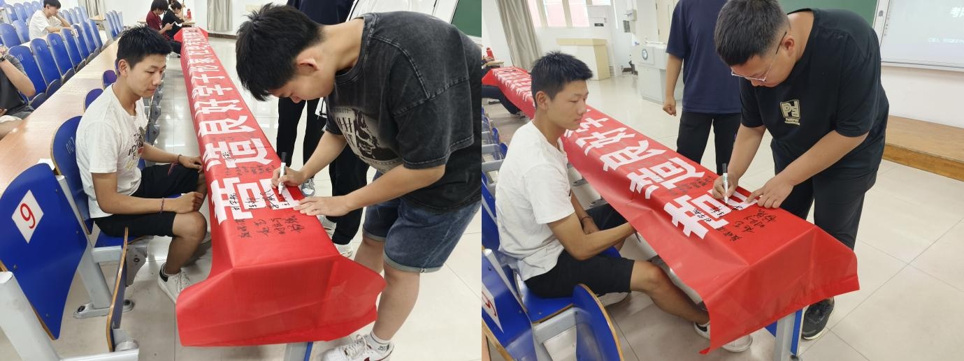 同学们郑重地在印有“营造良好学子形象,杜绝考试作弊行为”的横幅上签名,表明自己诚信考试的决心,并许下严格遵守考试纪律的承诺。