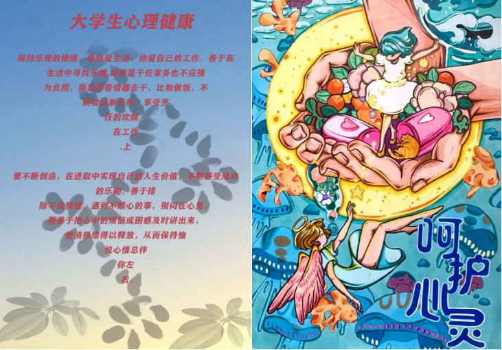 同学们以制作海报的形式来传达对心理健康的认知与内心的真情实感,将心理健康教育融入创新式的制作宣传片活动中,通过制作宣传作品调情绪、悦身心、享生活。作品内容紧紧围绕大学校园生活讲述心灵成长感悟,紧扣当代大学生心理成长实际,展现了心理健康正能量。