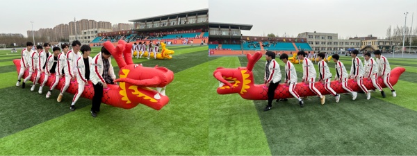 在旱地龙舟比赛中,同学们将双脚绑在一起,喊着整齐划一的口号,步调一致地奋力向前冲。他们齐心协力,龙舟在赛道上快速滑行,充分展现了团队协作的力量,各队之间你追我赶,竞争激烈而又充满欢乐。