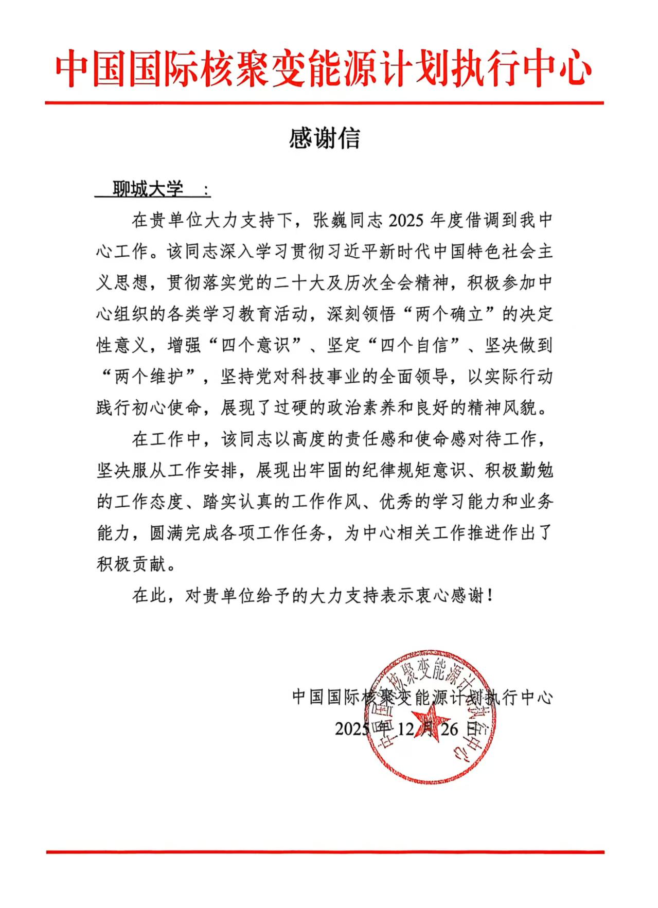 获科技部中国国际核聚变能源计划执行中心致信感谢
