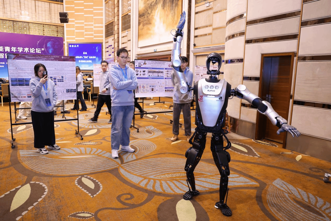 此外,论坛还设置了学术海报展示与大众投票环节。由北京通用人工智能研究院与乐聚机器人联合研发的全尺寸人形机器人“夸父”也在现场亮相,其灵活的动作和智能交互引发现场阵阵赞叹,生动诠释了科技创新的魅力。